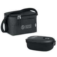 Borsa termica bicolore in PET riciclato (3 litri), pratica e sostenibile, con tasca frontale e tracolla regolabile.